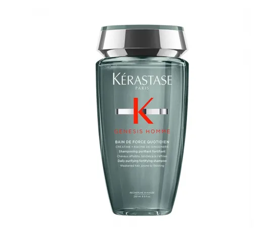 Το Genesis Homme Bain de Force Quotidien της Kérastase είναι ένα καθημερινό σαμπουάν καθαρισμού & ενδυνάμωσης, για άνδρες με αδύναμα μαλλιά με τάση λέπτυνσης. Καθαρίζει απαλά το τριχωτό, τα μαλλιά & τα γένια, προσφέροντας αίσθηση αναζωογόνησης, εξισορρόπησης και τόνωσης στο τριχωτό.