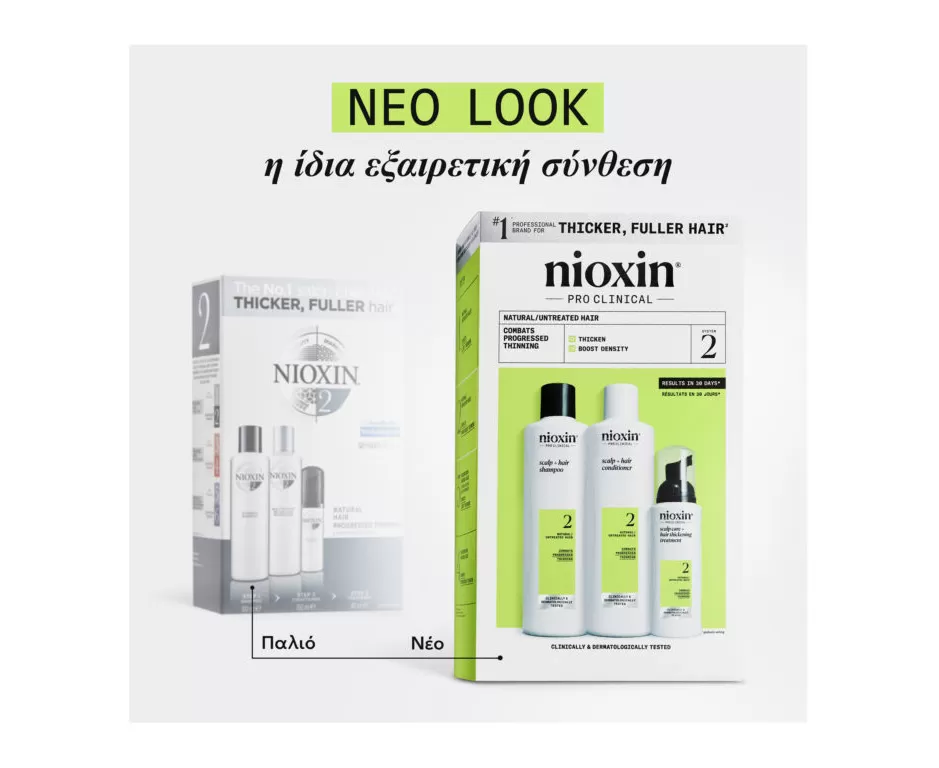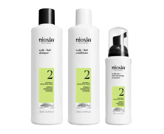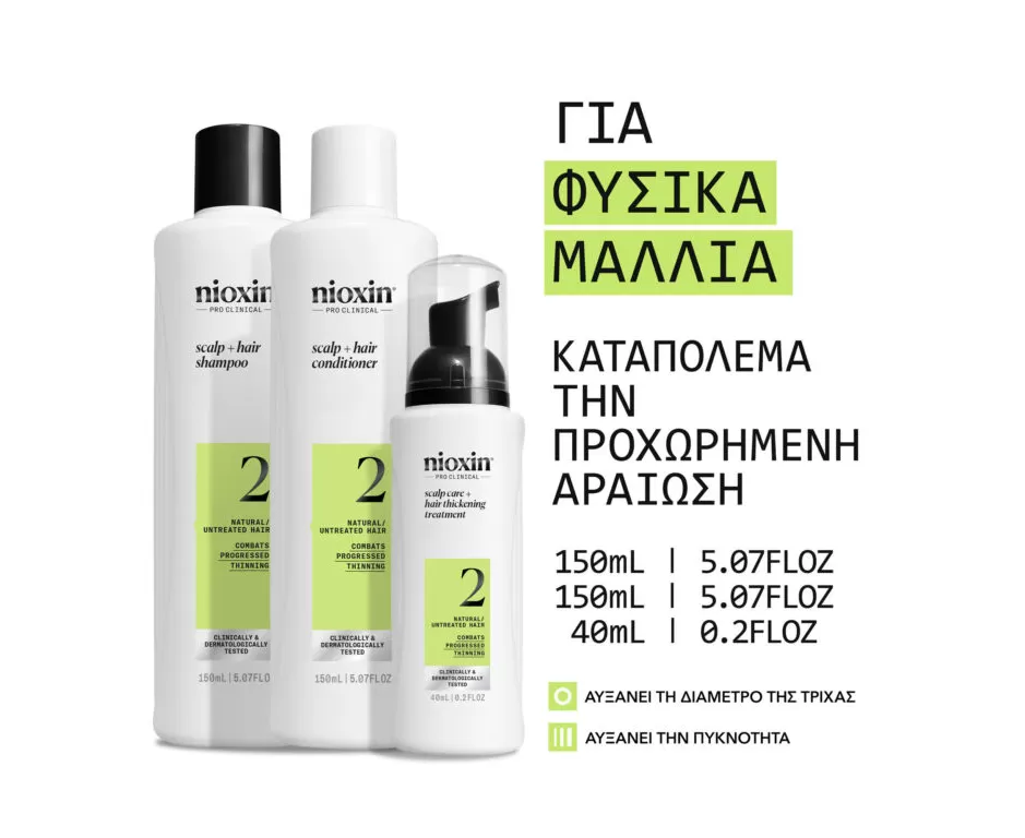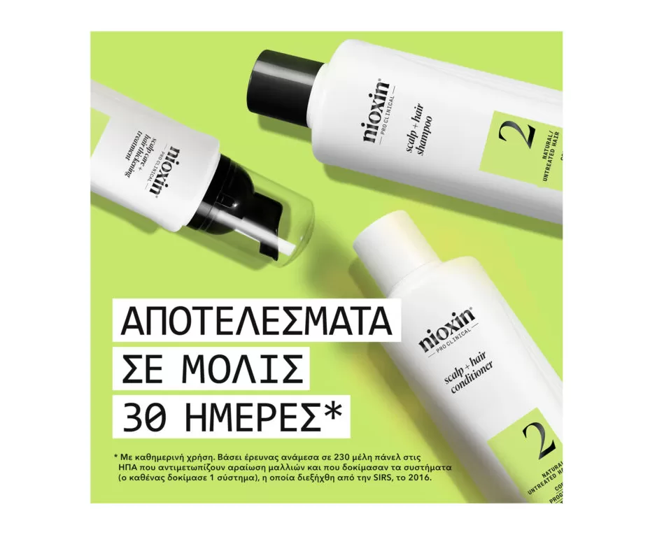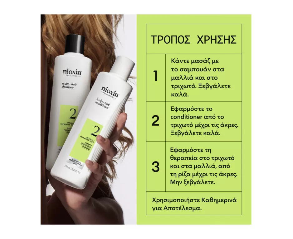 To Nioxin Σύστημα 2 Trial Kit (Σαμπουάν 150ml, Conditioner 150ml & Θεραπεία 100ml) αποτελεί μία ολοκληρωμένη επαγγελματική θεραπεία πύκνωσης για εμφανώς αραιά, λεπτά, φυσικά μαλλιά.