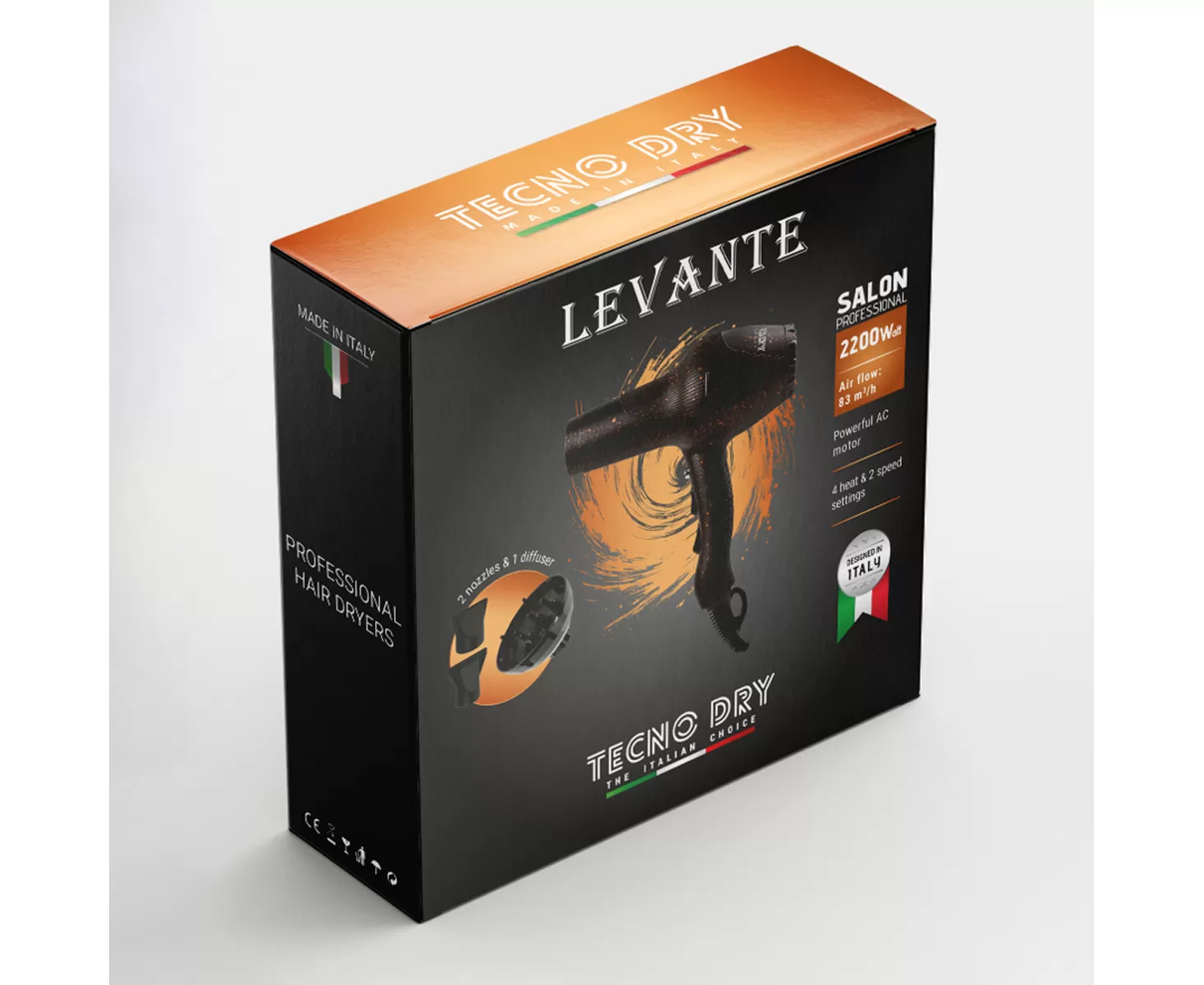 Ανακάλυψε το πανίσχυρο επαγγελματικό σεσουάρ μαλλιών 2200W Tecnodry Levante! Είναι ιδανικό για καθημερινή, εντατική χρήση στο κομμωτήριο και όχι μόνο, αφού εγγυάται αστραπιαίο και ομοιόμορφο στέγνωμα & styling. Διαθέτει επαγγελματικό AC ιταλικό μοτέρ μακράς διάρκειας με πανίσχυρη ροή αέρα 83 m³/h, αποσπώμενο φίλτρο για εύκολο καθαρισμό και αντιολισθητικό περίβλημα για εξαιρετικά σταθερό και ασφαλές κράτημα. Έτσι, υπόσχεται εντυπωσιακά αποτελέσματα και ολοκληρωμένη φροντίδα κατά το styling! Συνοδεύεται από 2 επαγγελματικά στόμια και 1 φυσούνα.
