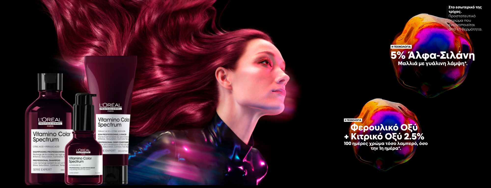 Η πρώτη τεχνολογία περιποίησης χρώματος, εμπλουτισμένη με Φερουλικό Οξύ + Κιτρικό Οξύ 2.5% που εισχωρεί στο εσωτερικό της τρίχας για να κλειδώσει τα μόρια της βαφής, επαναφέροντας τη ζωντάνια του χρώματος.